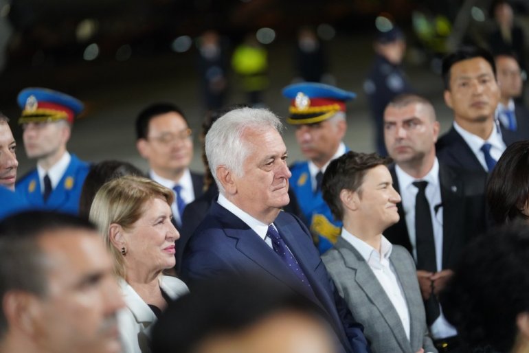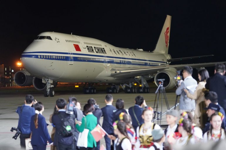 УЗ председника Александра Вучића и прву даму, кинеског председника Си Ђинпинга на црвеном тепиху дочекала је делегација Србије коју чине премијер Милош Вучевић, председница Скупштине Ана Брнабић, министар спољних послова Марко Ђурић, амбасадорка Србије у Кини Маја Стефановић и кинески амбасадор у Београду Ли Минг са супругом.