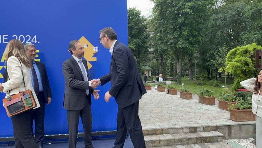 Председника Вучића дочекао је шеф делегације ЕУ у Србији, Емануел Жиофре.