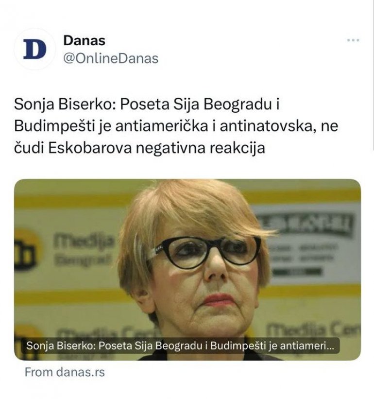 Бисерко је, коментаришући долазак Си Ђинпинга у Београд и Будимпешту, казала да је реч о "антиамеричкој и антинатовској посети", као и да не чуди "Ескобарова негативна реакција".