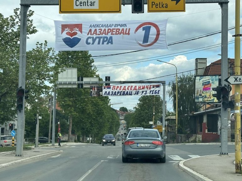 Како се може видети на фотографијама, на улазу у Лазаревац постављене су поруке подршке председнику, али и листи СНС Лазаревац "Александар Вучић - Лазаревац сутра".