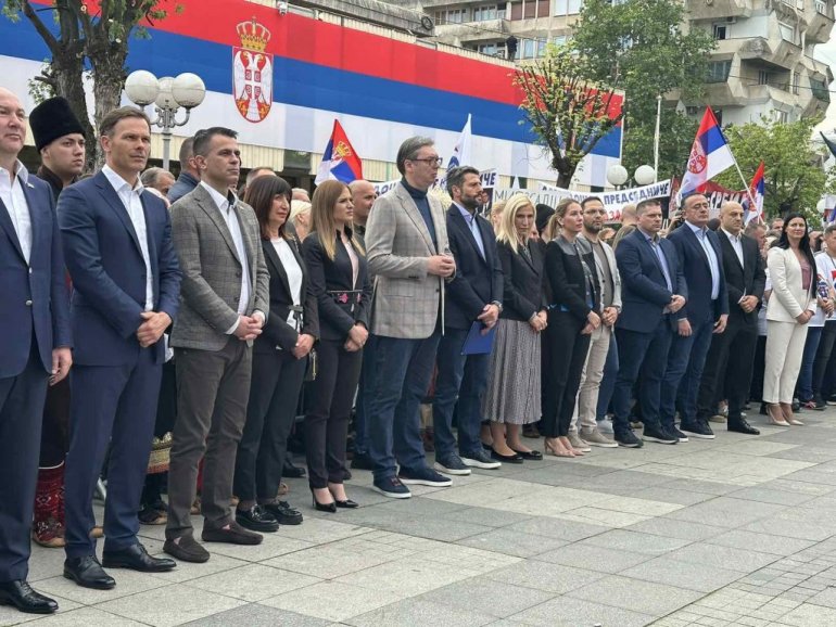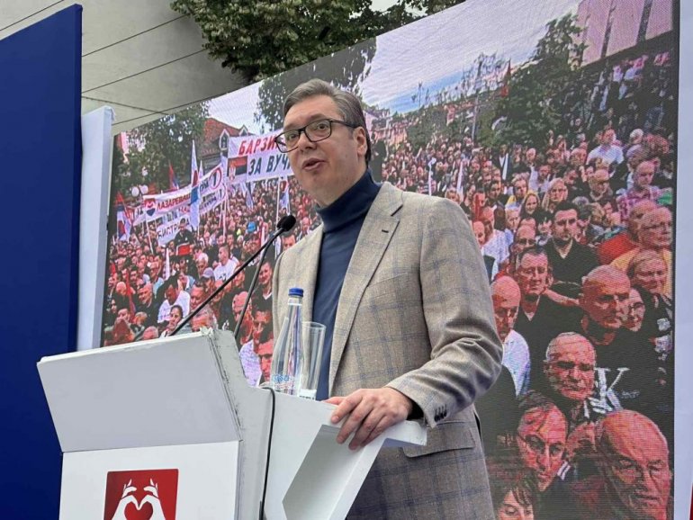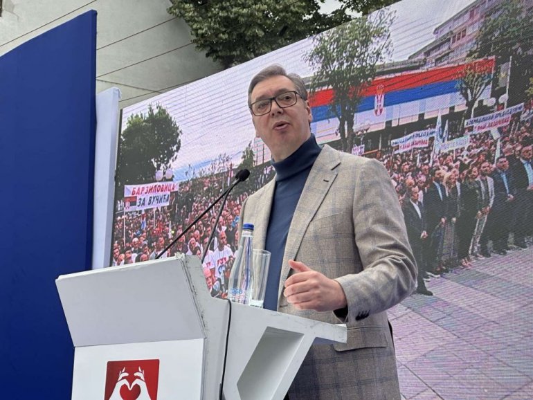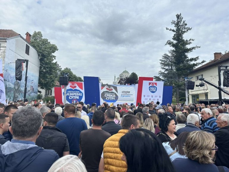 - Када су кренули са иницијативама да наш народ назову геноцидним, па нас онда данима обмањују шта је циљ тога, наш посао је да се боримо за нашу земљу, и не замерите што нам је Србија важнија од свега, и хвала вам што бринете за нашу земљу више него за било шта друго. Наредних дана када будем разговарао и са Шолцом и са украјинским, руским и другим званичницима хоћу да знате да ћемо у сваком тренутку да дамо све за нашу Србију, ма како то звучало некоме. Нашу Србију нећемо да дамо никоме и ни за шта на свету... Они су мислили да мала Србија неће смети да им се супростави и кад они кажу да морамо да се сагласимо са резолуцијом и са свим што траже, јер "ми смо велики, ви сте мали". Мислили су да ћемо као неки пре 20 година да сагнемо главу, ми смо рекли да знамо колико су велики, али да знамо да нема веће светиње од наше Србије и зато ћемо вам се супроставити у Њујорку и у Бриселу и било где да желите да укинете српски народ - рекао је Вучић.