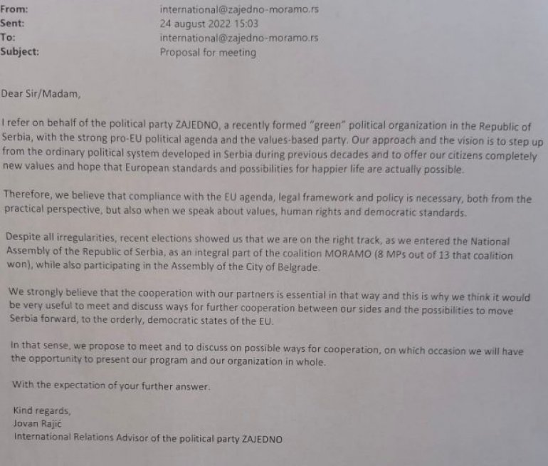 То доказује мејл у ком су предлагали састанак, а понуду је упутио у име Заједно адвокат Јован Рајић. Напомињемо, да су сви наведени политичари здушно прихватили тезу да је у Сребреници почињен геноцид, као и то да независност Косова што пре треба признати.