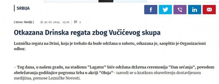 Наиме, у тексту под називом "Отказана Дринска регата због Вучићевог скупа", поменути портал помен жртвама Олује назива "Вучићевим контрамитингом".