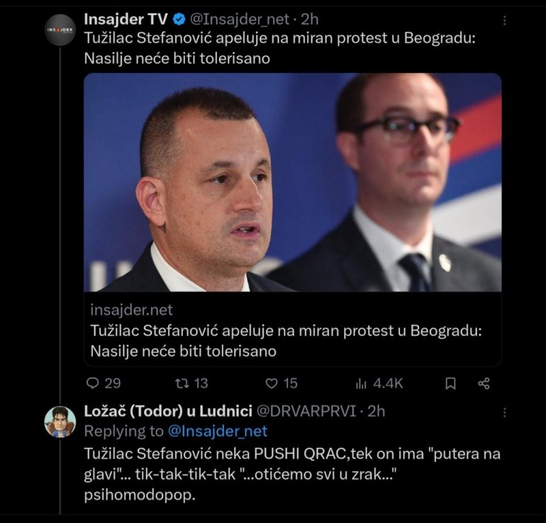 НАКОН што је апеловао на учеснике сутрашњег политичког протеста у Београду, да све прође мирно, тужилац Стефановић суочио се са ужасним претњама
