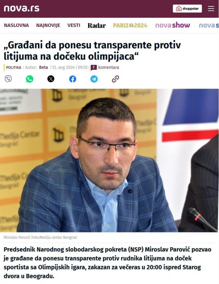 Наиме, на опозиционом медију Нова данас је освануо чланак у коме председник НСП-а Мирослав Паровић позива грађане да транспаренте против литијума понесу на дочек спортиста са Олимпијских игара, који треба да се одржи вечерас у 20 часова, испред Старог двора у Београду.