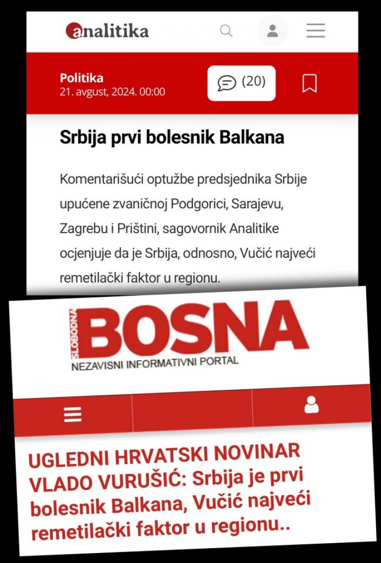 - Коментаришући оптужбе председника Србије упућене званичној Подгорици, Сарајеву, Загребу и Приштини, саговорник Аналитике оцењује да је Србија, односно Вучић, највећи реметилачки фактор у региону - стоји на порталу Аналитика чију вест је моментално пренела "Слободна Босна" са још срамнијим насловом: