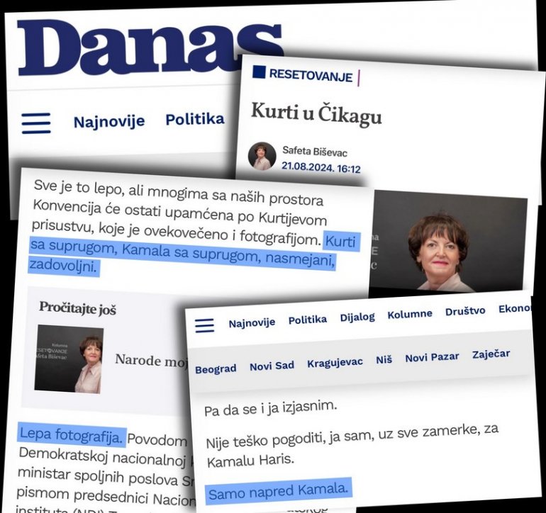 САФЕТА Бишевац, новинарка “Данаса”, који је у власништву тајкуна Драгана Шолака, написала је хвалоспев о присуству Аљбина Куртија предизборној конвенцији Камале Харис, кандидаткиње Демократске странке за председницу САД.