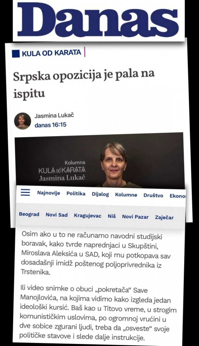 ЈАСМИНА Лукач, новинарка “Данаса”, који је у власништву тајкуна Драгана Шолака, написала је колумну у којој је нагрдила опозиционе лидере. “Данас” је колумну објавио на ударном месту на свом порталу.