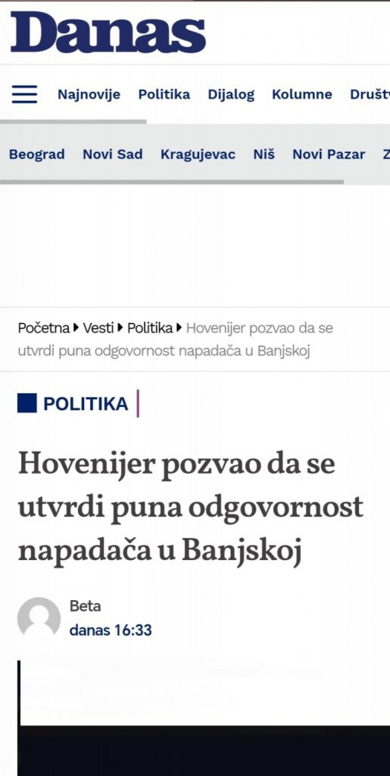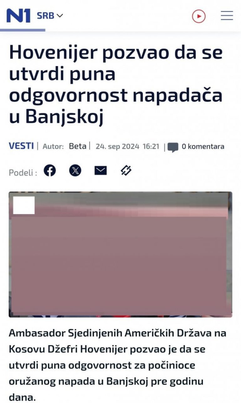 Ипак, опозициони медији који се налазе у власништву тајкуна Драгана Шолака, преносе речи амбасадора САД у Приштини Џефрија Ховенијеракоји позива "да се утврди пуна одговорност" за Бањску.