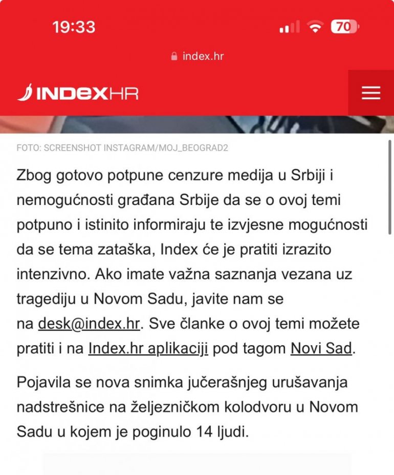 - Због готово потпуне цензуре медија у Србији и немогућности грађана Србије да се о овој теми потпуно и истинито информирају те извјесне могућности да се тема заташка, Индекс ће је пратити изразито интензивно. Ако имате важна сазнања везана уз трагедију у Новом Саду, јавите нам се на деск@индеx.хр - наводи овај портал, представљајући се као брижан према Србима и објективан.
