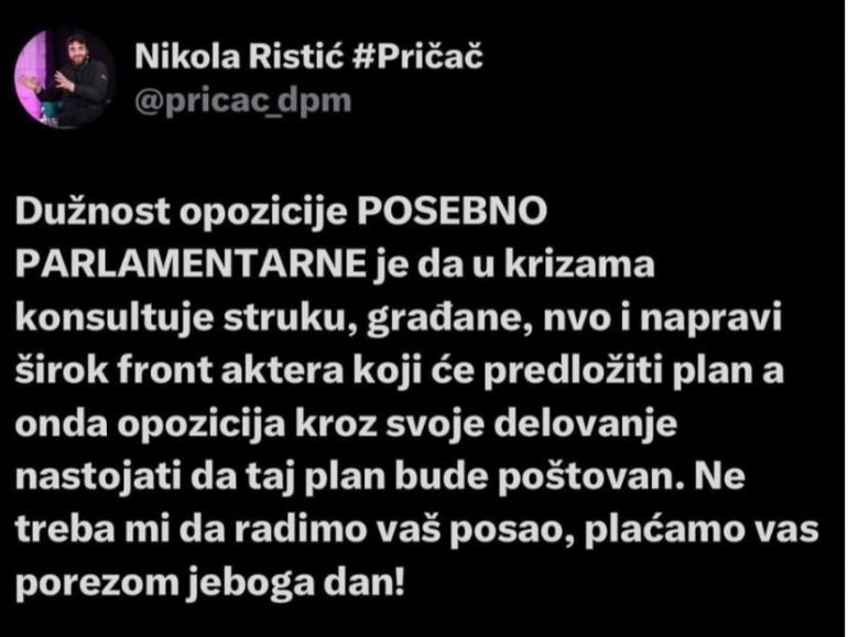 - Дужност опозиције, посебно парламентарне, јесте да у кризама консултује струку, грађане, НВО и направи широк фронт актера који ће предложити план, а онда опозиција кроз своје деловање настојати да тај план буде поштован. Не треба ми да радимо ваш посао, плаћамо вас порезом - изјавио је Ристић.