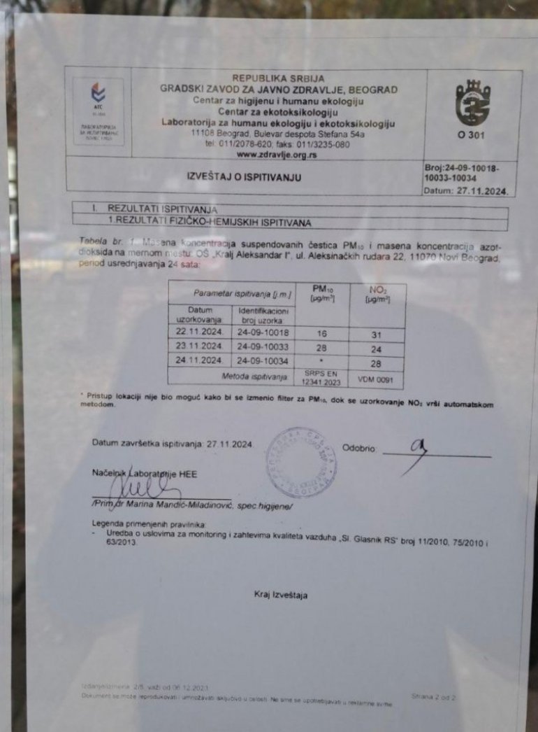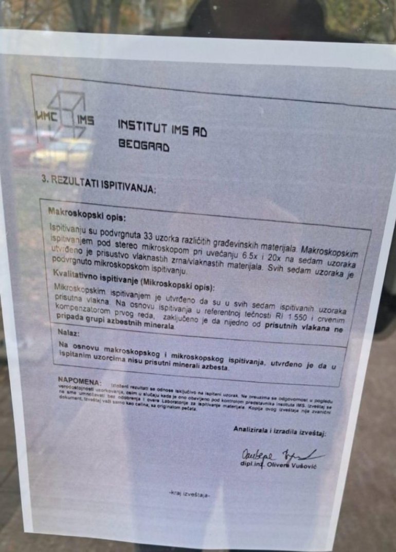 На основу испитивања у референтној течности RI 1550 и црвеним компензатором првог реда закључено је да ниједно од присутних влакана не припада групи азбестних минерала. На основу испитивања утврђено је да нису присутни минерали азбеста, наводи се у саопштењу.