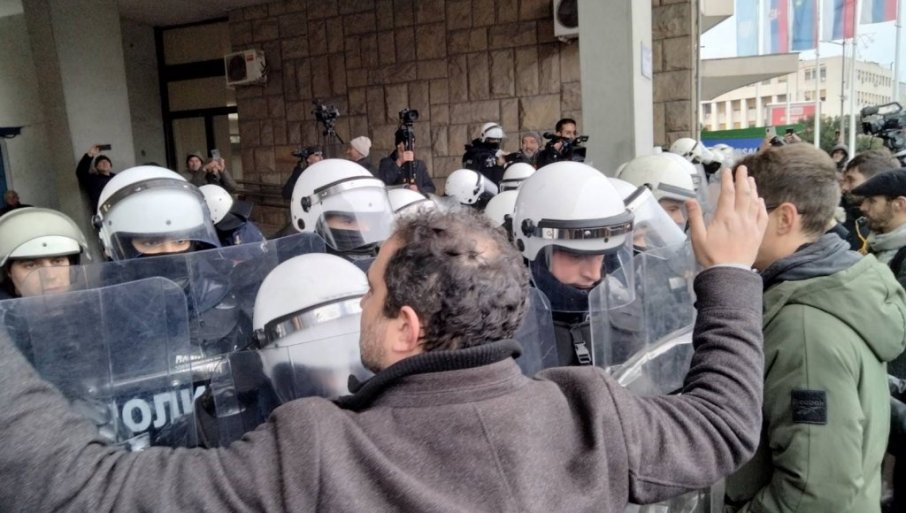 НАСЛАЊАЈУ СЕ НА ШТИТОВЕ, НАСРЋУ НА ПОЛИЦИЈУ: Хаос у Новом Саду у режији опозиције (ФОТО)