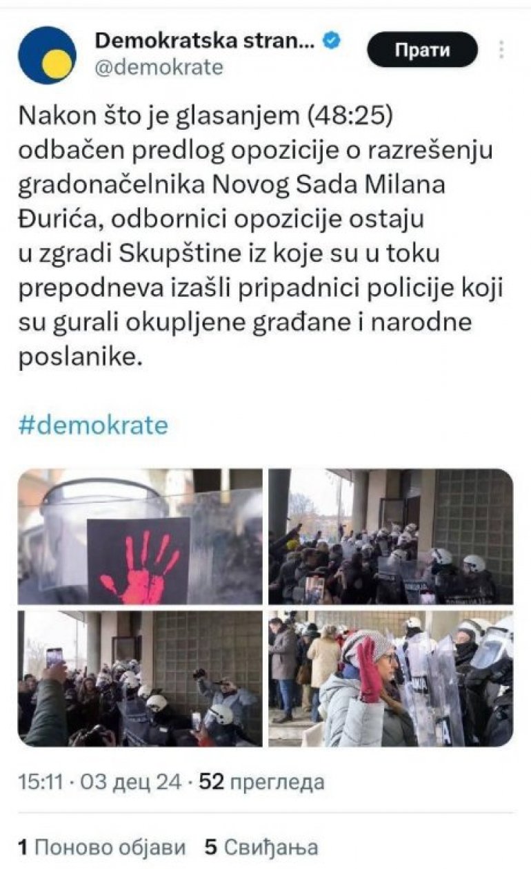 Такође, и на Твитер налогу Демократске странке објављен је план да одборници опозиције остану у Скупштини након гласања о разрешењу градоначелника Новог Сада.