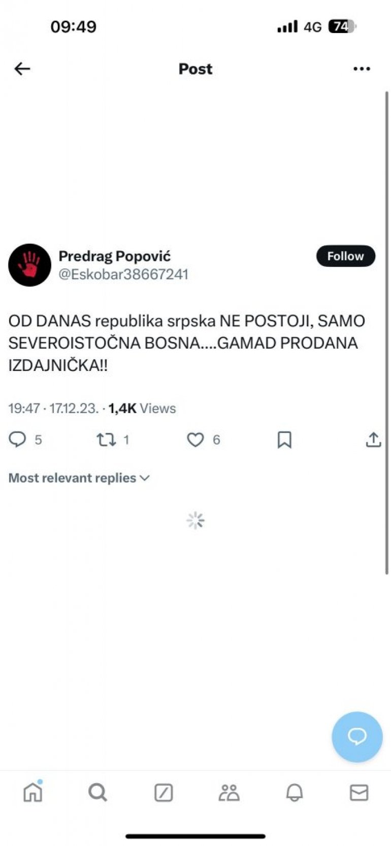 - Од данас Република Српска не постоји, само североисточна Босна, гамад продана издајничка - написао је Поповић, намерно пишући име Републике Српске малим словима.
