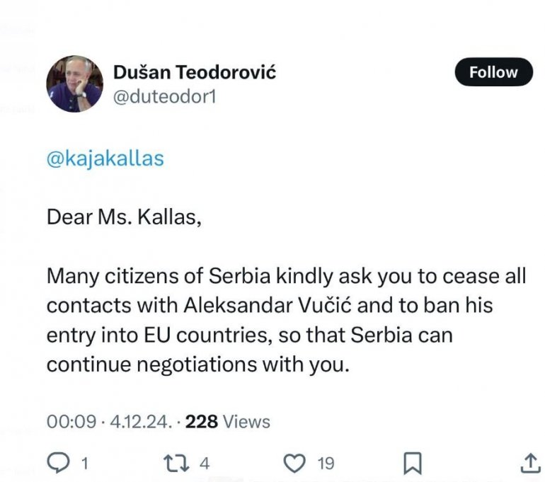 ИДЕОЛОГ опозиције Душан Теодоровић тражи од Европске уније да "забрани улазак у ЕУ Александру Вучићу".