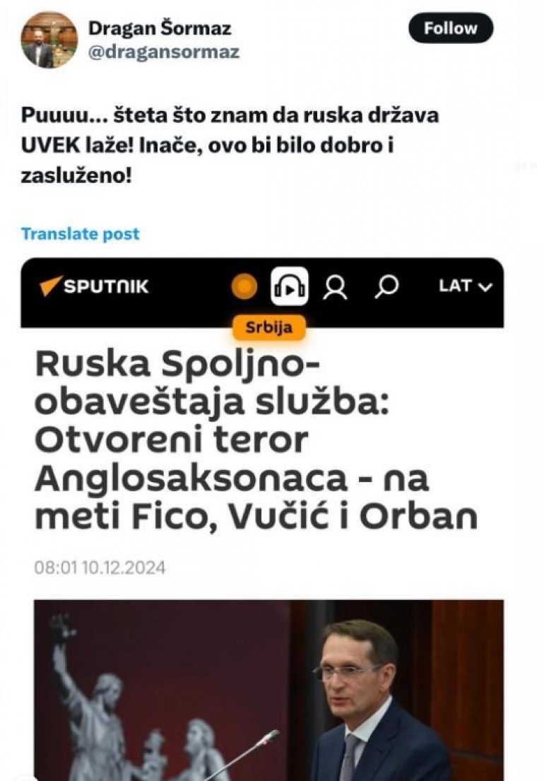 ДРАГАН Шормаз, опозиционар Драгана Ђиласа, поводом информације руске обавештајне службе да су Александар Вучић, Роберт Фицо и Виктор Орбан у опасности да буду физички елиминисани, изјавио је да би то било "добро и заслужено".