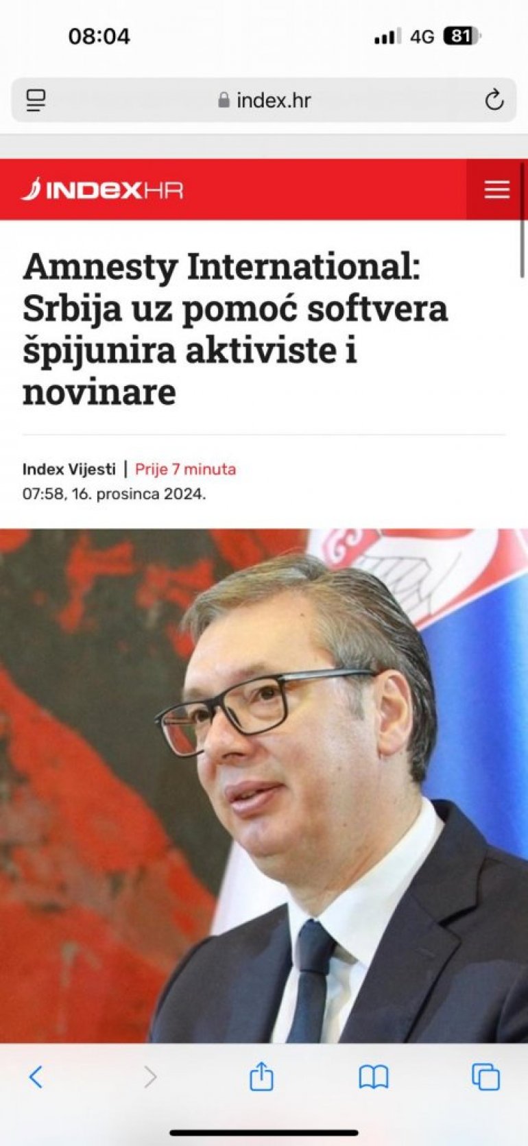 У ТОКУ је најжешћи хибридни рат против Републике Србије и председника Александра Вучића, а хрватски портал Индекс.хр објавио је вест под насловом ''Србија уз помоћ алата израелске фирме шпијунира активисте'', не часећи ни часа у пласирању лажи само да би се нашкодило угледу Републике Србије у светским оквирима.