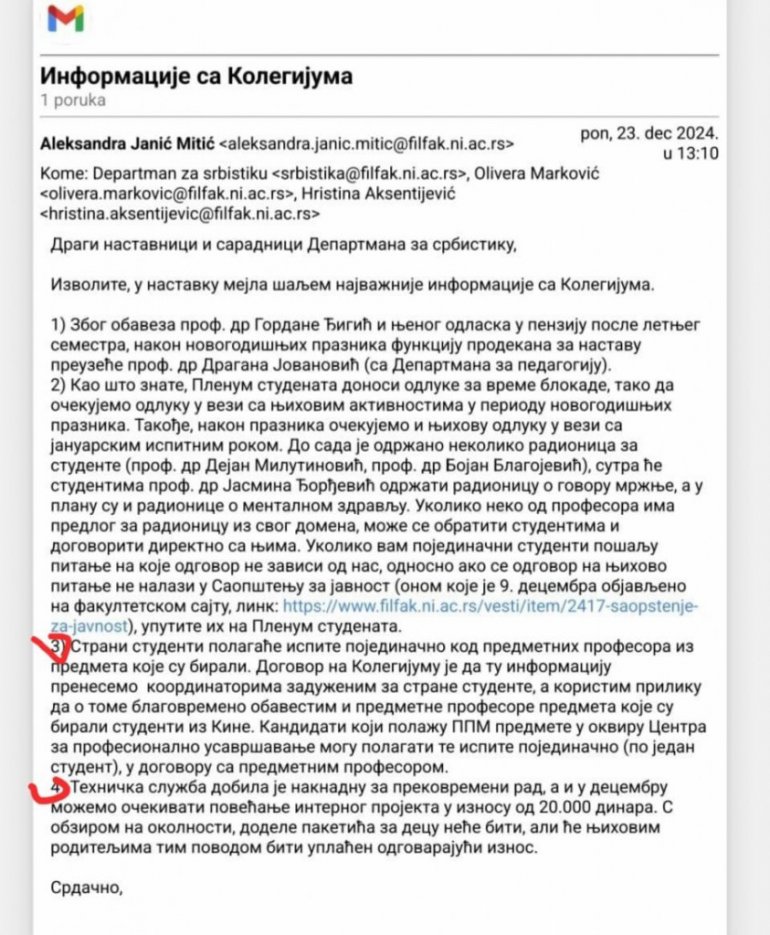 Без блама дели накнаде за прековремени рад, а најављује и повећања на "интерном пројекту" од по 20.000, наводи се у званичном имејлу са колегијума факултета.