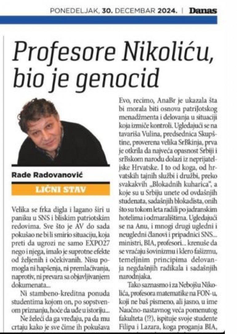 После Таталовић, професору је јутрос преко опозиционих новина поручено:- Николићу, Срби су починили геноцид, а ти то одбијаш да признаш и зато ниси пожељан професор за наше студенте.