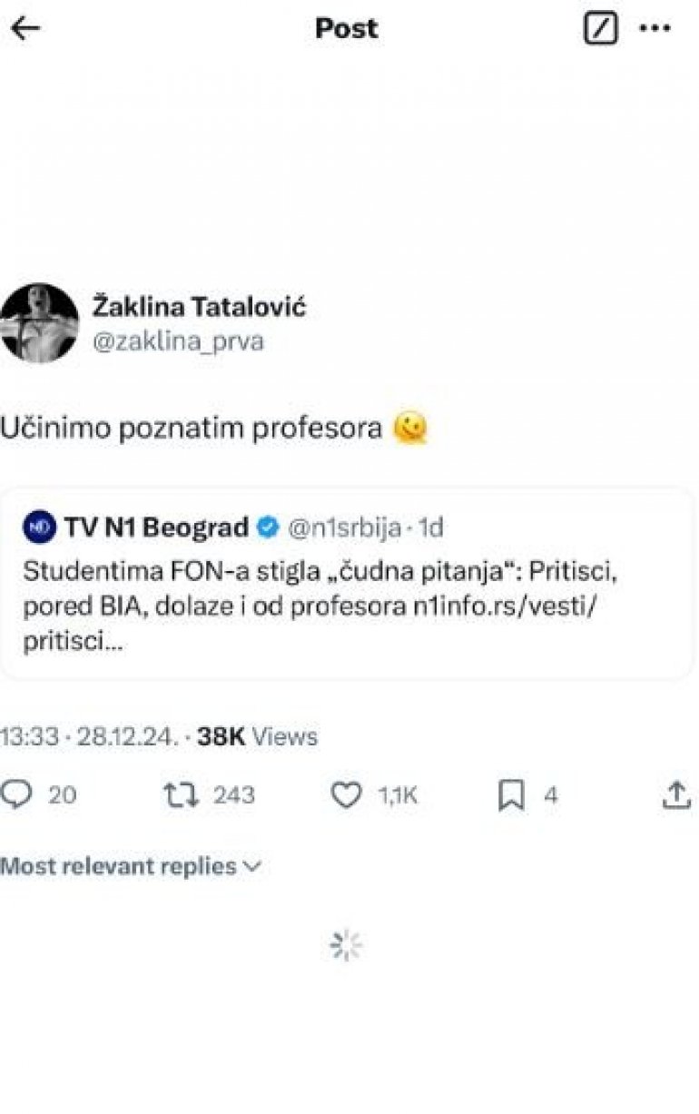 - Учинимо познатим професора - написала је Жаклина Таталовић.