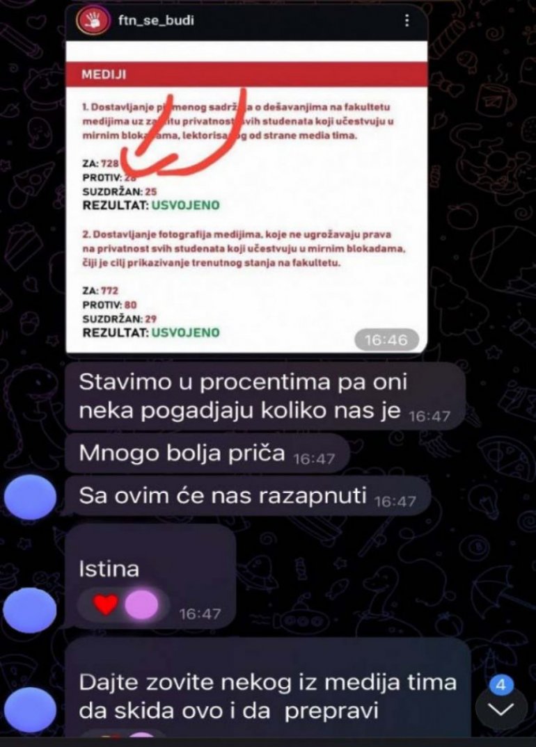 "Имамо ту и дописивања гласова у табеле од стране појединаца да би добили исход који желе, зато и варирају гласови на различитим питањима, а највећа манипулацију која је спроведена је када су објављени резултати 4. пленума и направљена објава на инстраграму од стране медија тима", каже Бабић и прилаже доказе о комуникацији чланова из Телеграм групе.