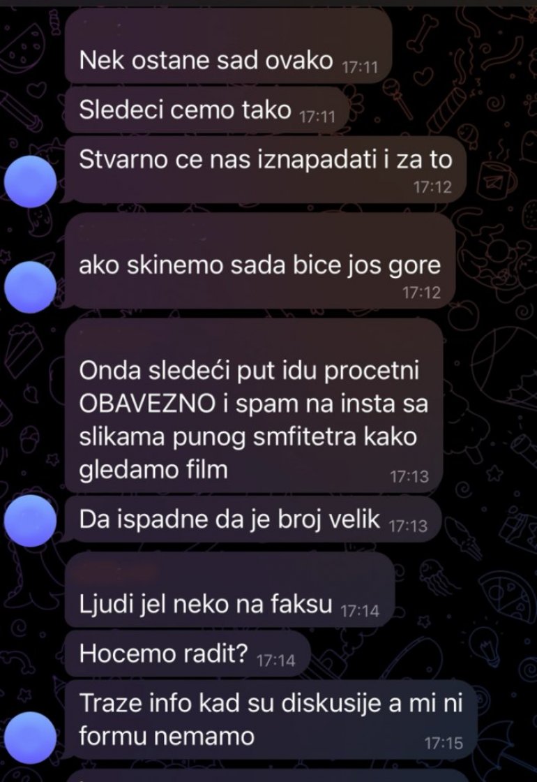 "Када су схватили да не могу да муљају онда су рекли да ће на следећој објави да ставе проценте а не број гласова, и да би убедили људе да има пуно људи онда ће да иде „спам на инста“ са сликама пуног амфитеатра како гледамо филм. У амфитеатру Факултета техничких наука има 200 седећих места, и никада се не попуне сва јер људи неће да се гурају, тако да остане доста празних места између људи и то значи да је реалан број људи далеко мањи од 200 када делује да је пун амфитеатар", каже Бабић и додаје да се примена те врсте манипулације десила на 5. пленуму:
