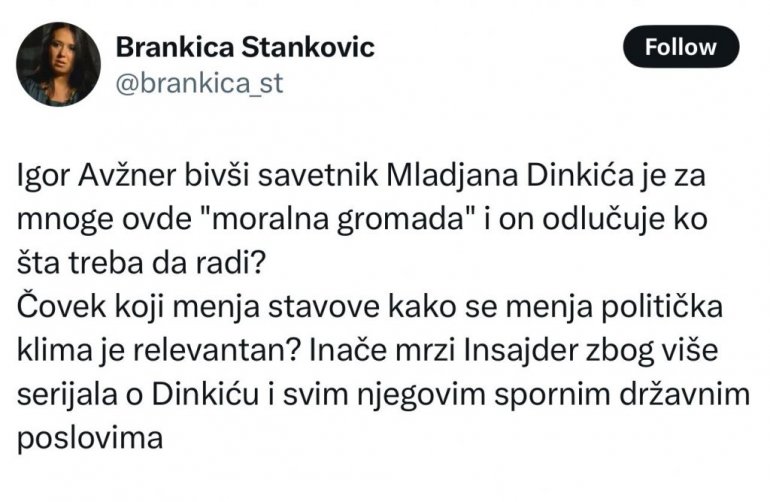 - Игор Авжнер бивши саветник Млађана Динкића је за многе овде "морална громада" и он одлучује ко шта треба да ради? Човек који мења ставове како се мења политичка клима је релевантан? Иначе мрзи Инсајдер због више серијала о Динкићу и свим његовим спорним државним пословима - написала је Станковићева на друштвеној мрежи Икс.