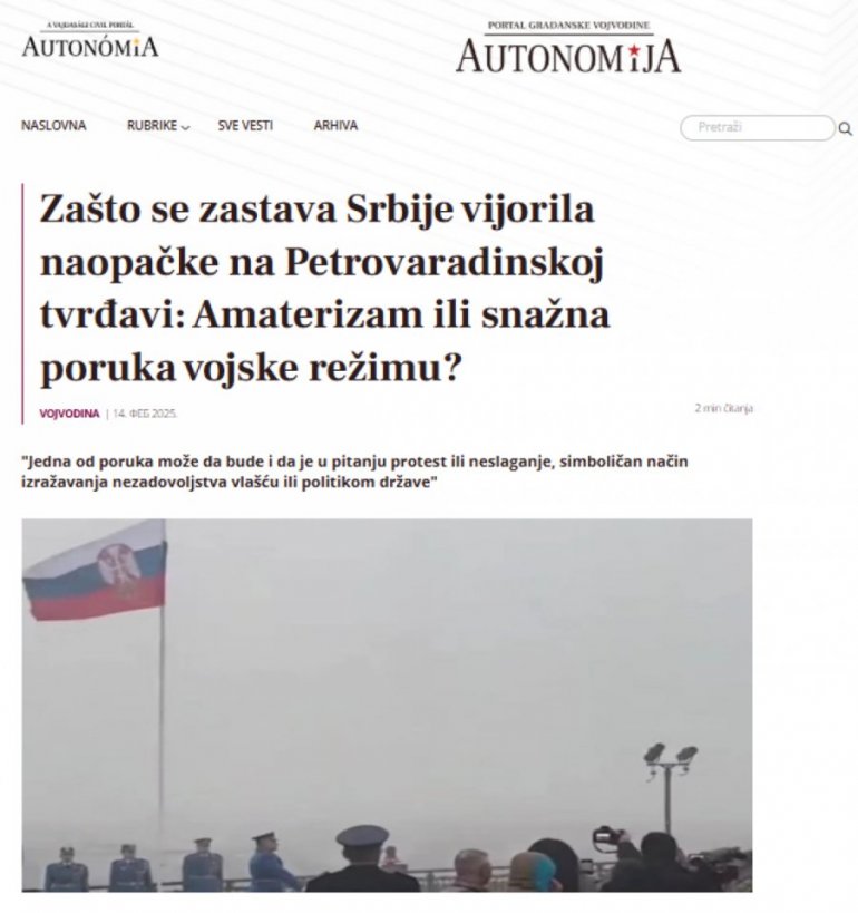 Чак и када је Војска Србије издала саопштење у којем се каже, уз навођење видео и фото доказа, да је застава била истакнута по свим правилима, те да је због јаког ветра само на тренутак окренула страну, портал Аутономија није објавила тај деманти.