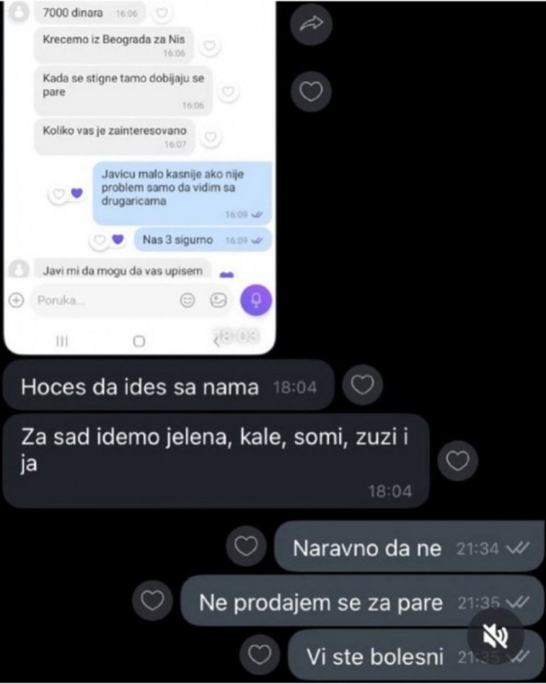Особа која одговара на поруку је навела "да се не продаје за паре", као и да су "болесни".