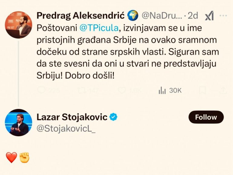 -Поштовани Тонино Пицула, извињавам се у име пристојних грађана Србије на овако срамном дочеку од стране српских власти. Сигуран сам да сте свесни да они у ствари не представљају Србију! Добро дошли! - поручои је Александрић.