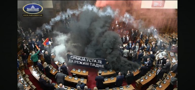Хаос је почео када је након усвајања дневног реда од 62 тачке, посланик Зелено-левог фронта Радомир Лазовић, у тренутку када су у салу почели да улазе министри како би образложили законе, кренуо према говорници у чему га је спречило скупштинско обезбеђење. Одмах за њим кренула је и његова колегиница Биљана Ђорђевић, након чега је уследило гурање. Убрзо након тога, запаљене су бакље и скупштинска сала испунила се димом, док су се посланици гурали, ударали, чупали за одела и косе. Осим бакљи, бацане су и флаше са водом и цели картони јаја, а појединци су користили и бибер-спреј. Осим екипа Хитне помоћи, у Дому Народне скупштине јуче су били и ватрогасци и полиција.
