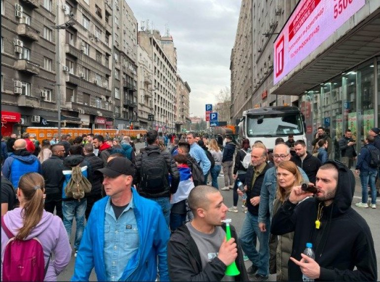 БОЉШЕВИЧКИ пленумаши под ликом студената блокадера, а у ствари хулигани, синоћ су у Улици кнеза Милоша број 7, са зграде Савеза инжењера и техничара Србије, њих 12, гађало каменицама. За сада је пристутно четири блокадера и хулигана на истом местом, спремни да наставе са насиљем.