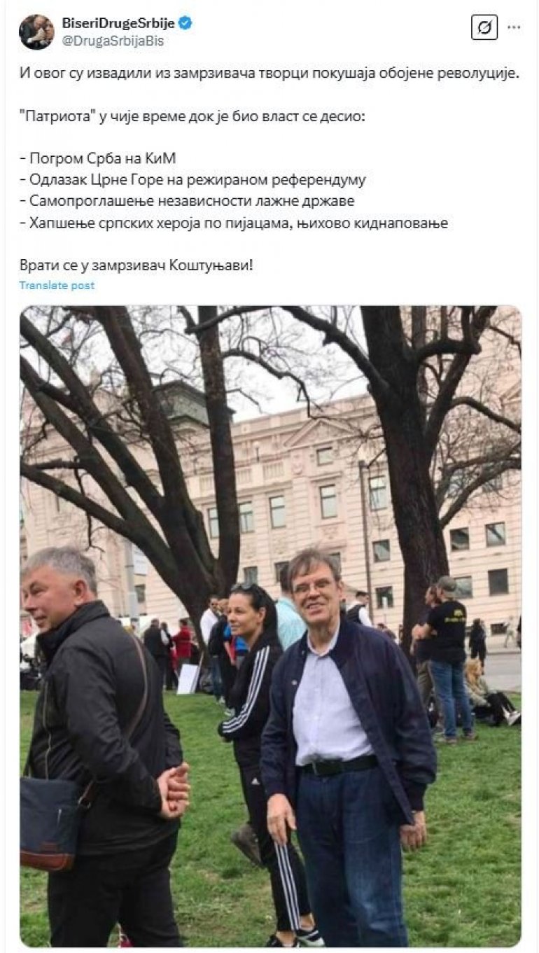 "И овог су извадили из замрзивача творци покушаја обојене револуције. "Патриота" у чије време док је био власт се десио: - Погром Срба на КиМ - Одлазак Црне Горе на режираном референдуму - Самопроглашење независности лажне државе - Хапшење српских хероја по пијацама, њихово киднаповање Врати се у замрзивач Коштуњави!", написао је један од корисника на друштвеној мрежи Икс.