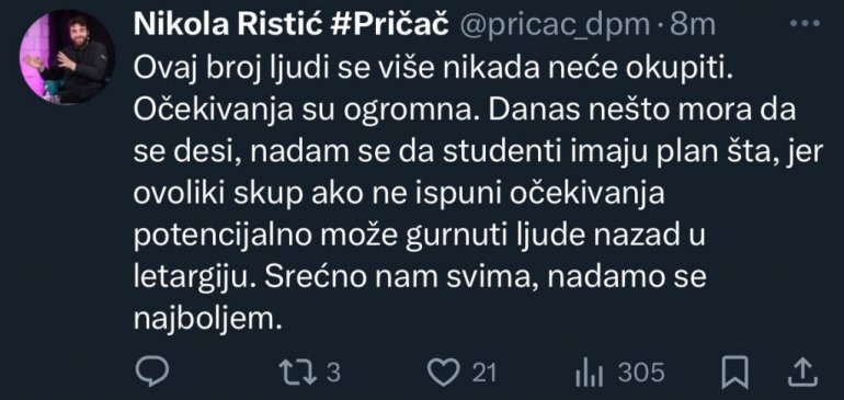 - Овај број људи се више никада неће окупити. Очекивања су огромна. Данас нешто мора да се деси, надам се да студенти имају план шта, јер оволики скуп ако не испуни очекивања