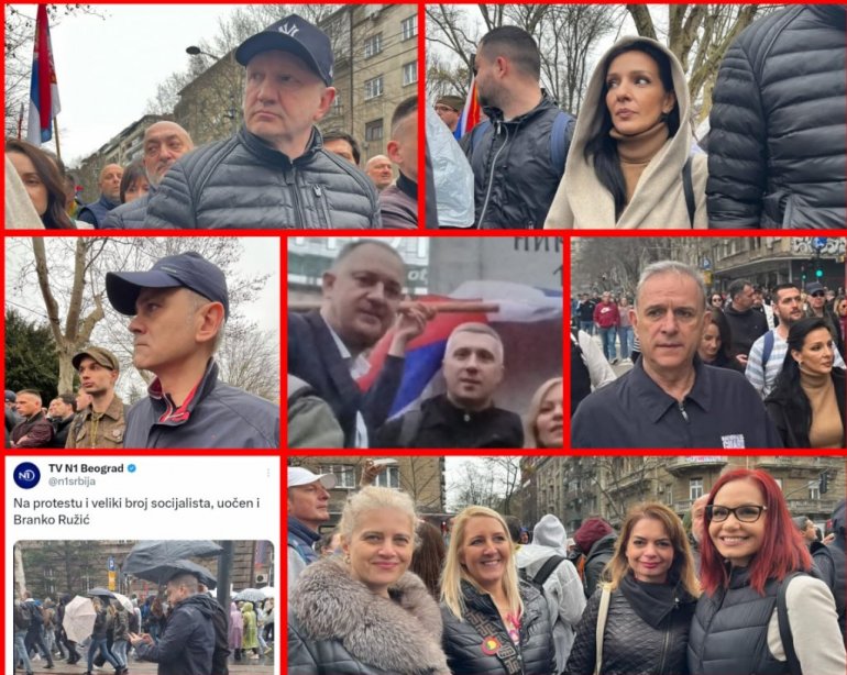 На протесту је и Радомир Лазовић из Зелено левог фронта који је у друштву пивопија. На протесту су и Милош Јовановић и Мирослав Алексић који су по сценарију Куртија палили Скупштину и покушали да убију још нерођеног Гаврила.