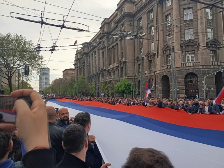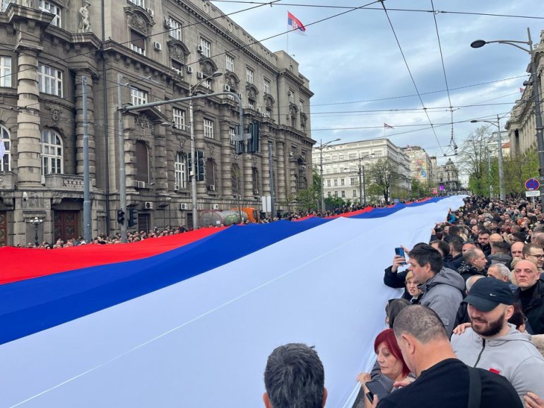 Председник Александар Вучић је око 17.30 сати испред Председништва код Пионирског парка дочекао најдужу заставу која је пренета од владе до парламента, где је почео свенародни скуп и истакао да је су грађани послали најлепшу могућу поруку - да не дају Србију.