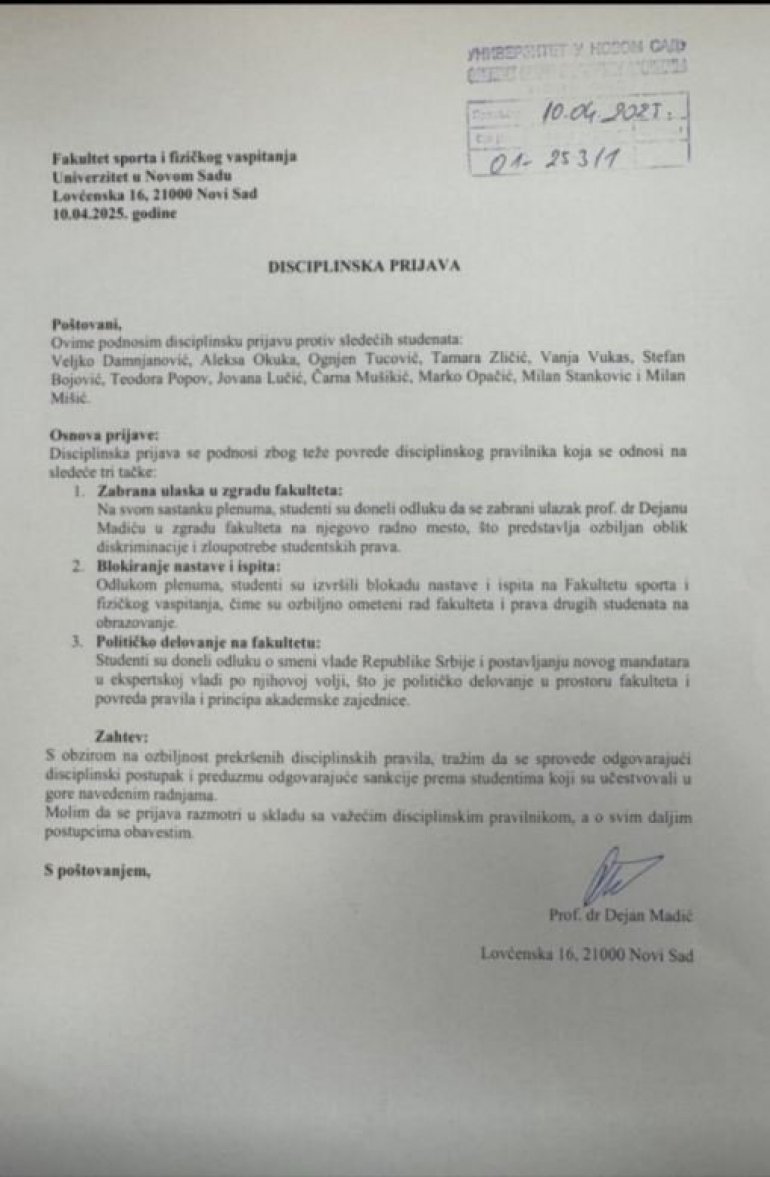 ОД Факултета спорта и физичког васпитања Универзитета у Новом Саду затражено је покретање дисциплинског поступка против групе блокадера због, како се наводи, озбиљних повреда академских правила и нарушавања реда у образовној установи.