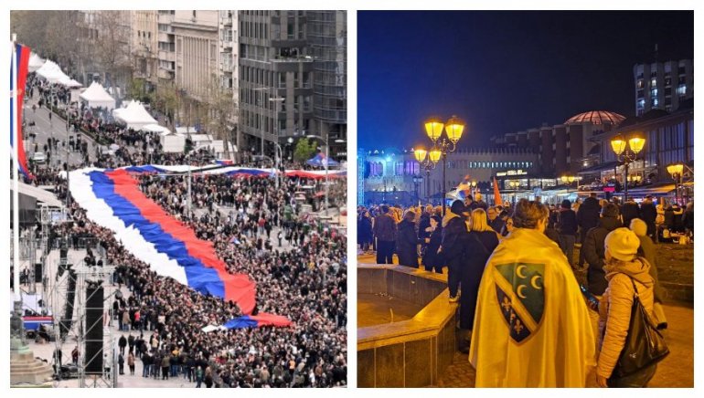СЛИКА ПОНОСА И СЛИКА СРАМОТЕ: У Београду на народном скупу највећа застава Србије, а на дочеку студената блокадера вијоре се заставе Санџакa