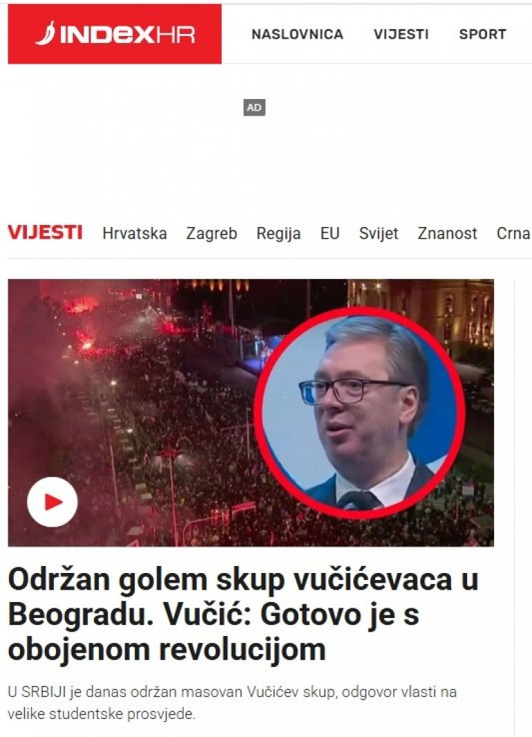 ХРВАТСКИ медији преносе вести о свенародном скупу у Београду на којем је говорио председник Србије Александар Вучић.