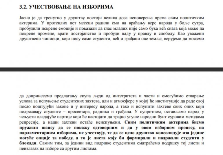 - Свим политичким актерима бисмо пружили шансу да се покажу одговорним и да у овом изборном процесу, на парламентарним изборима, не учествују, те да се цело друштво консолидује иза једине могуће опције за победу, а то је листа коју би формирали и подржали студенти у блокади. Самим тим, за једини вид подршке студентима сматраћемо подршку тој листи и неизлазак на изборе са другим листама - наводи се, између осталог, у тексту.
