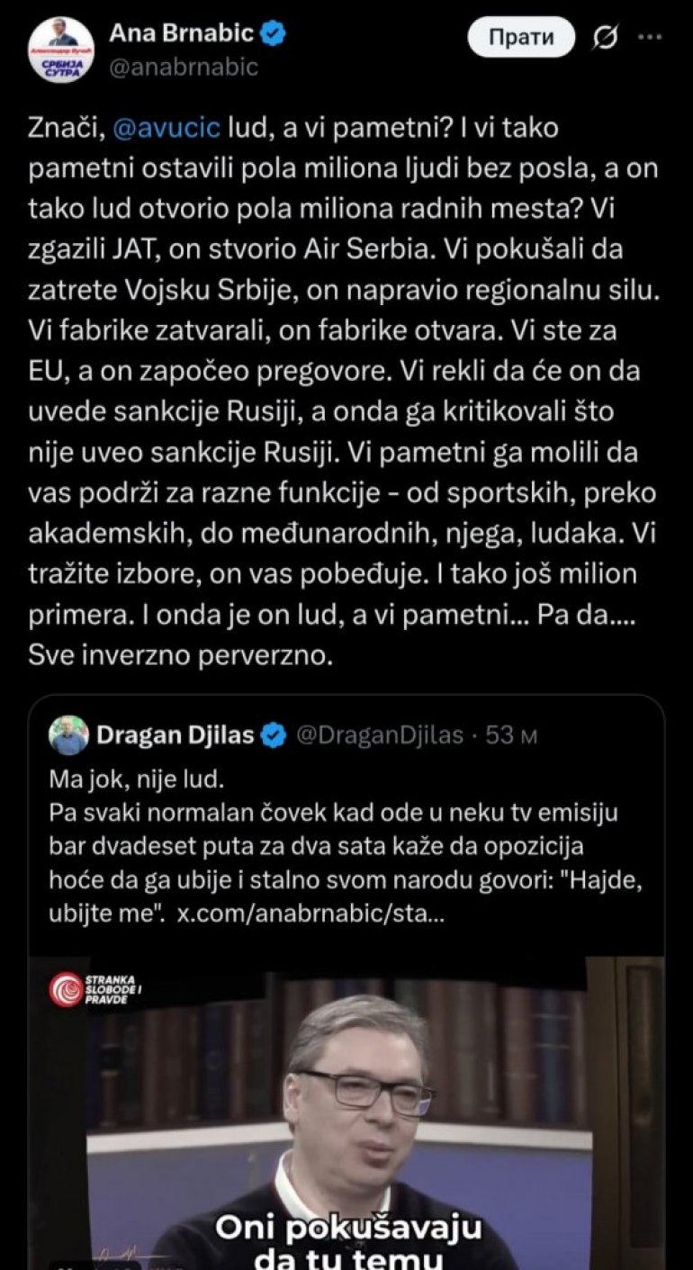 - Значи, @avucic луд, а ви паметни? И ви тако паметни оставили пола милиона људи без посла, а он тако луд отворио пола милиона радних места? Ви згазили ЈАТ, он створио Аир Сербиа. Ви покушали да затрете Војску Србије, он направио регионалну силу. Ви фабрике затварали, он фабрике отвара. Ви сте за ЕУ, а он започео преговоре. Ви рекли да ће он да уведе санкције Русији, а онда га критиковали што није увео санкције Русији. Ви паметни га молили да вас подржи за разне функције - од спортских, преко академских, до међународних, њега, лудака. Ви тражите изборе, он вас побеђује. И тако још милион примера. И онда је он луд, а ви паметни... Па да.... Све инверзно перверзно. Написала је Брнабић на друштвеној мрежи ''Икс''.