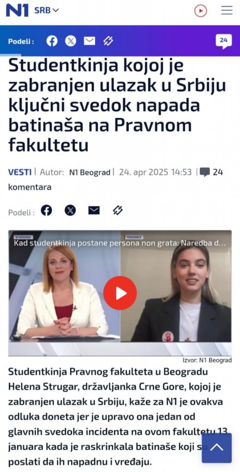 Хелена Стругар, студенткиња Правног факултета и држављанин Црне Горе, чија је сестра раније била у вези са сином Мила Ђукановића, јуче је сазнала да је добила забрану уласка у Србију (барем тако она тврди). Наводи да је разлог тог акта чињеница да је сведочила о том инциденту који се догодио на Правном факултету и да је зато "држава узела на зуб".