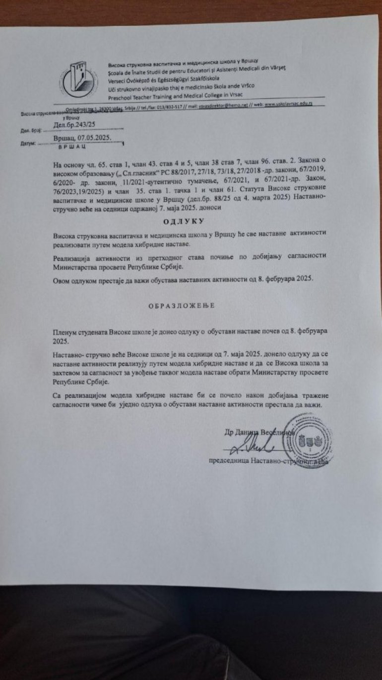 ВИСОКА струковна васпитачка и медицинска школа у Вршцу излази из вишемесечне блокаде и најављује прелазак на хибридни модел наставе, чим Министарство просвете Републике Србије да своју сагласност.