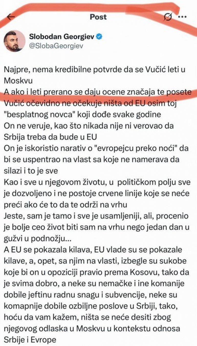 У својој објави у 13.29 сати на мрежи Икс, Георгиев је написао да "нема кредибилне потврде да Вучић лети у Москву", док је председник Србије Александар Вучић већ увелико био на путу.