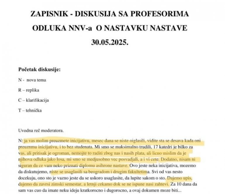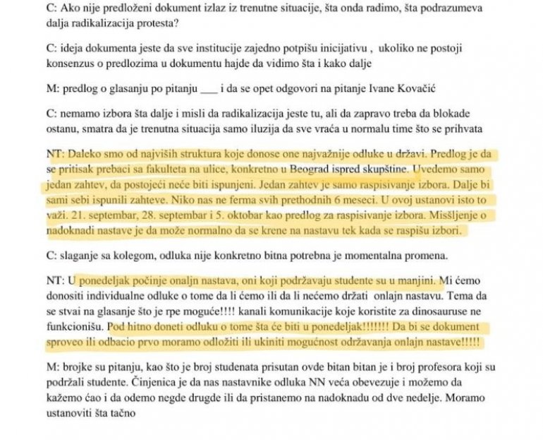 - Далеко смо од највиших структура које доносе оне најважније одлуке у држави. Предлог је да се притисак пребаци са факултета на улице, конкретно у Београд испред скупштине. Уведемо само један захтев, да постојећи неће бити испуњени. Један захтев је само расписивање избора - пише између осталог у записнику.