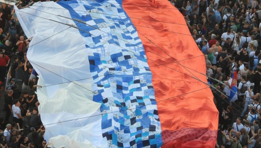 БЛОКАДЕРИ који се налазе на Славији уместо српске тробојке, развили су "измењену" заставу Србије, а на плавој боји направили су мотиве усташке шаховнице.