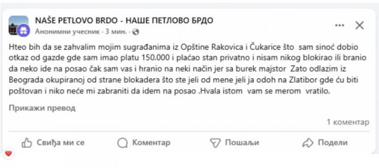 - Хтео бих да се захвалим мојим суграђанима из Општине Раковица и Чукарице што сам синоћ добио отказ од газде, где сам имао плату 150.000 и плаћао стан приватно и нисам никог блокирао или бранио да неко иде на посао. Чак сам вас и хранио на неки начин, јер сам бурек мајстор. Одлазим из Београда, окупираног од стране блокадера. Одох на Златибор, где ћу бити поштован и нико ми неће забранити да идем на посао. Истом вам се мером све вратило - написао је.