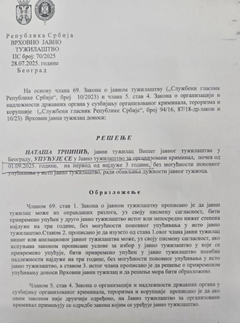 ЈАВНА тужитељка, Наташа Трнинић, која је 1. августа потписала наредбу о спровођењу истраге уместо тужиоца Александра Барца, јер се он у том моменту налазио на Сардинији на годишњем одмору, како ексклузивно сазнајемо, само три дана раније добила је решење о продужењу упућивања у Тужилаштво за организовани криминал.