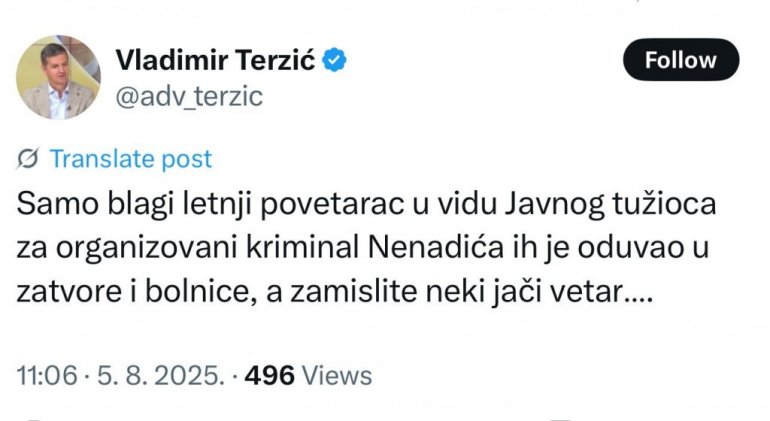 - Само благи летњи поветарац у виду Јавног тужиоца за организовани криминал Ненадића их је одувао у затворе и болнице, а замислите неки јачи ветар - рекао је Владимир Терзић, блокадерски адвокат.